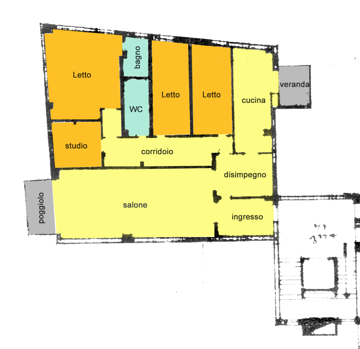 L'appartamento è composto da un accogliente ingresso, salone con accesso diretto al poggiolo, cucina abitabile dotata di veranda finestrata ideale come lavanderia o dispensa/ripostiglio, studio, due camere singole e una camera matrimoniale con bagno privato. Completano la proprietà il secondo bagno principale e comoda zona corridoio per eventuali armadi.